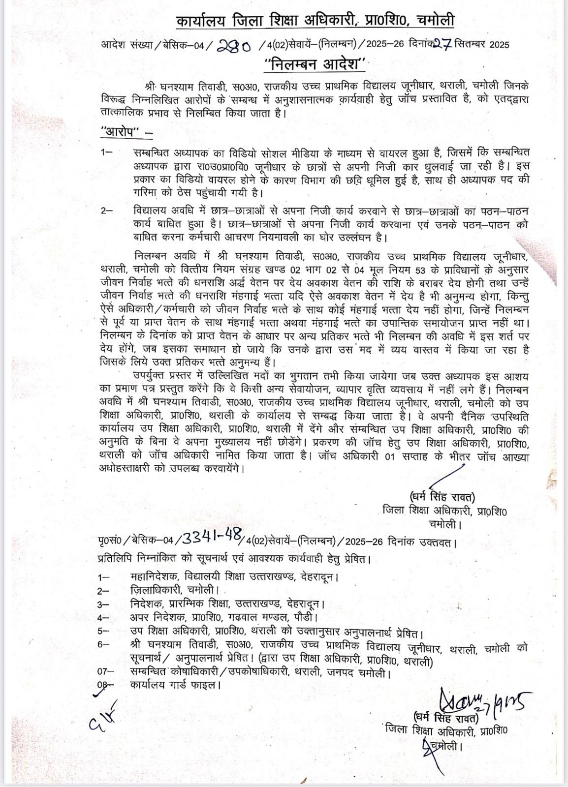 घनश्याम तिवाड़ी सहायक अध्यापक थराली चमोली को विभाग ने किया निलंबित