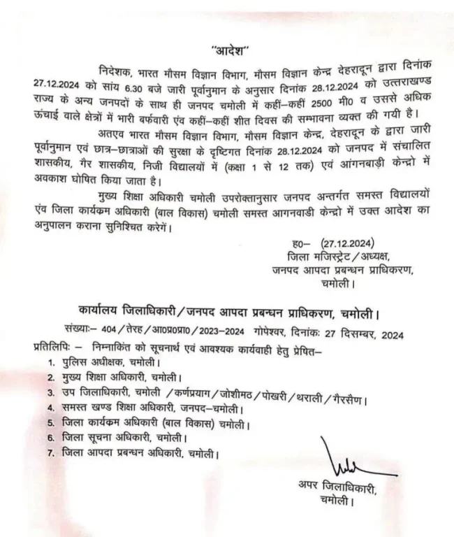 मौसम विभाग ने चमोली जिले में भी बारिश और बर्फबारी का अलर्ट जारी किया है जिसके चलते कल यानि की 28 दिसम्बर को निजी और सरकारी सभी स्कूलों और आंगनबाड़ी केंद्रों को बंद करने का आदेश जारी किया गया है.
