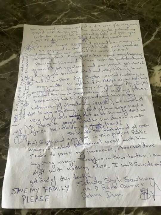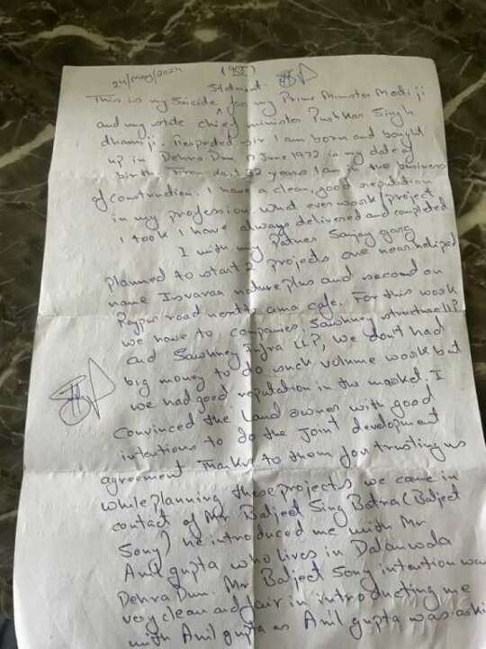 बता दें कि पुलिस को मौके पर सुसाइड नोट भी बरामद हुआ जो पीएम और सीएम के नाम लिखा था जिसमे उन्होंने अपने परिवार को बचाने की अपील की है और लिखा किप्लीज सेफ माय फैमिली। वहीँ आत्महत्या से पहले लिखें गए सुसाइड नोट पर दो व्यवसाई भाइयों अनिल गुप्ता और अजय गुप्ता को अपनी आत्महत्या के पीछे दोषी ठहराया है. और उनका नाम लिखा।