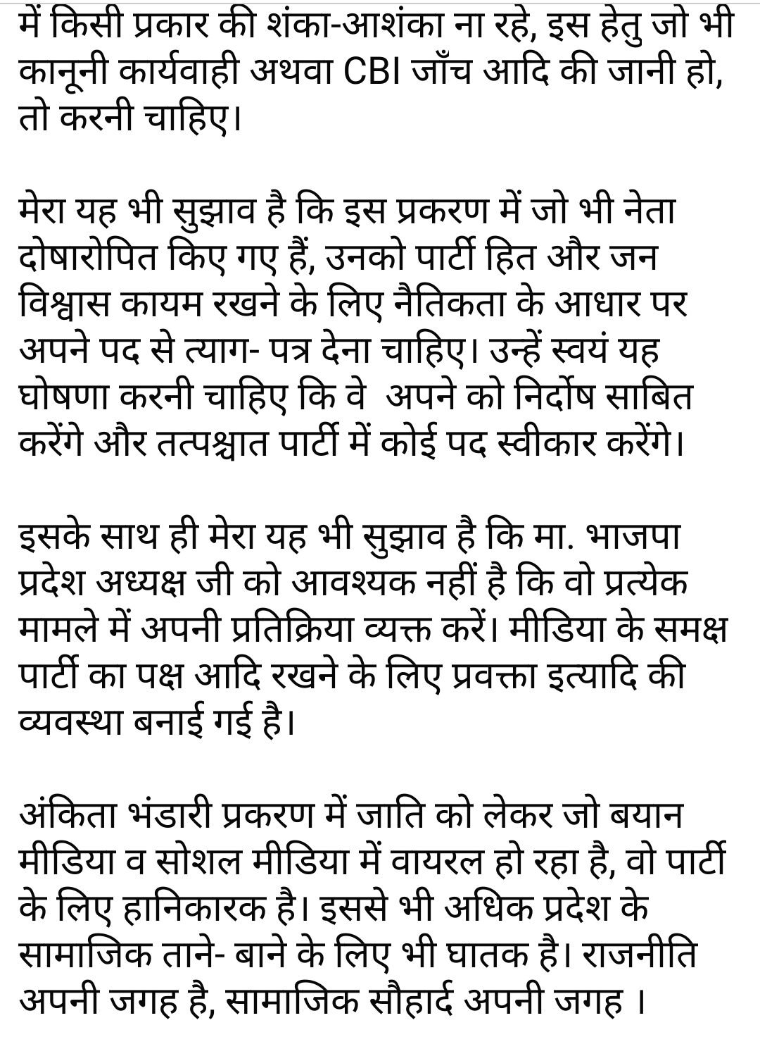 मेरा स्पष्ट रूप से मानना है कि अंकिता भंडारी प्रकरण निश्चित रूप से गंभीर विषय है। आम जनमानस के मन में किसी प्रकार की शंका-आशंका ना रहे, इस हेतु जो भी कानूनी कार्यवाही अथवा CBI जाँच आदि की जानी हो, तो करनी चाहिए।