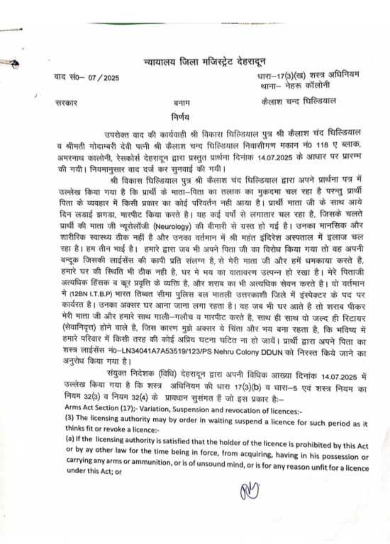 जिला प्रशासन से मिली जानकारी के अनुसार 17 जुलाई, 2025 जिलाधिकारी सविन बंसल ने मां और बेटे के लिए खतरे का सबब बने शस्त्र लाईसेंस को निरस्त कर दिया है. दरसल विगत जनता दिवस में रेसकोर्स निवासी विकास घिल्डियाल ने बताया कि उसकी माता पिता के तलाक होने के बाद भी उसके पिता लाइसेंसी बंदूक से उसे और उसकी माता को डराया धमकाया करते है,जिससे कभी भी अप्रिय घटना हो सकती है..ऐसे में सगे बेटे व पत्नी के लिए ही खतरे का सबब बना शस्त्र को डीएम ने विशेषाधिकार प्रयोग कर मौके पर ही लाइसेंस निलंबित करने के साथ ही सम्बन्धित के विरूद्ध मुकदमा दर्ज करने के निर्देश दिए थे.इस मामलें पर DM द्वारा विधिवत् आदेश कर दिया।