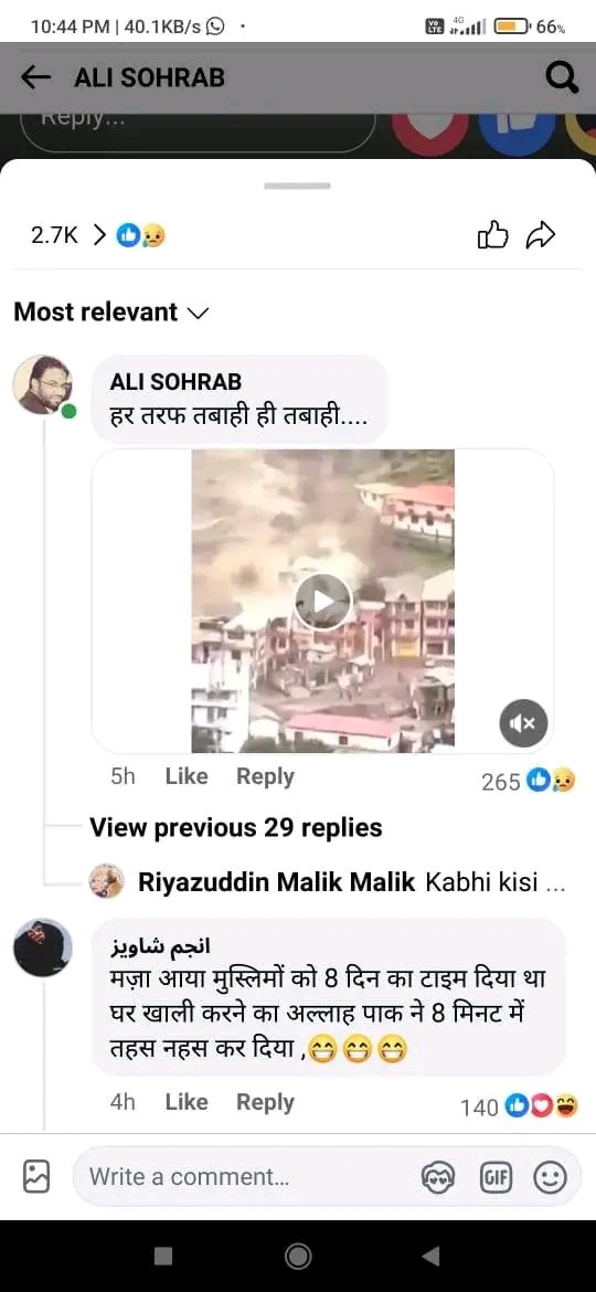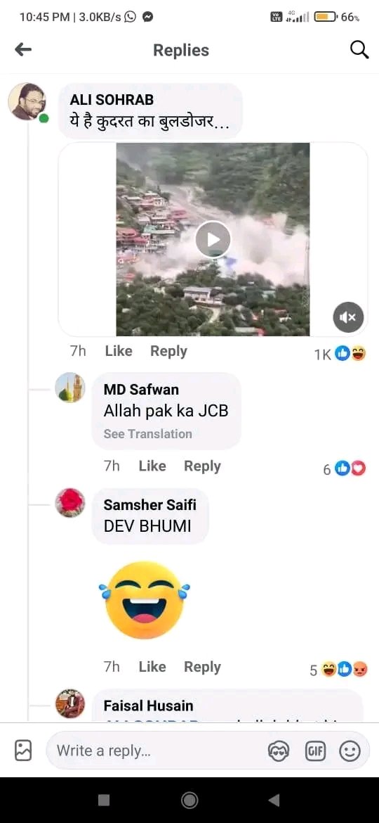 देहरादून :धराली में आई प्राकृतिक आपदा के सम्बन्ध में सोशल मीडिया पर आपत्तिजनक पोस्ट का संज्ञान लेकर दून पुलिस ने मुकदमा दर्ज किया। मुस्लिम धर्म के लोगों ने धराली आपदा के चित्रों को फेसबुक पर अपलोड कर समुदाय विशेष के लोगो द्वारा आपत्तिजनक टिप्पणी की थी।