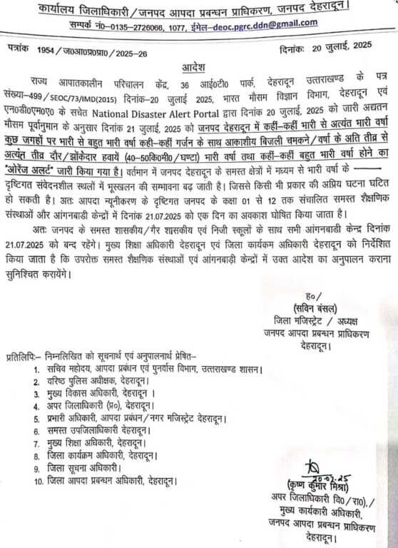 देहरादून : भारतीय मौसम विभाग और राष्ट्रीय आपदा प्रबंधन केंद्र की संयुक्त चेतावनी के बाद देहरादून ज़िले में 21 जुलाई 2025 को भारी से बहुत भारी वर्षा की संभावना को देखते हुए जिला प्रशासन ने एहतियाती कदम उठाए हैं।मौसम विभाग द्वारा जारी अलर्ट के अनुसार, कहीं-कहीं अत्यंत तीव्र वर्षा के साथ 40–50 किलोमीटर प्रति घंटे की रफ्तार से तेज हवाएं चलने का अनुमान है। इसे देखते हुए “ऑरेंज अलर्ट” जारी किया गया है।