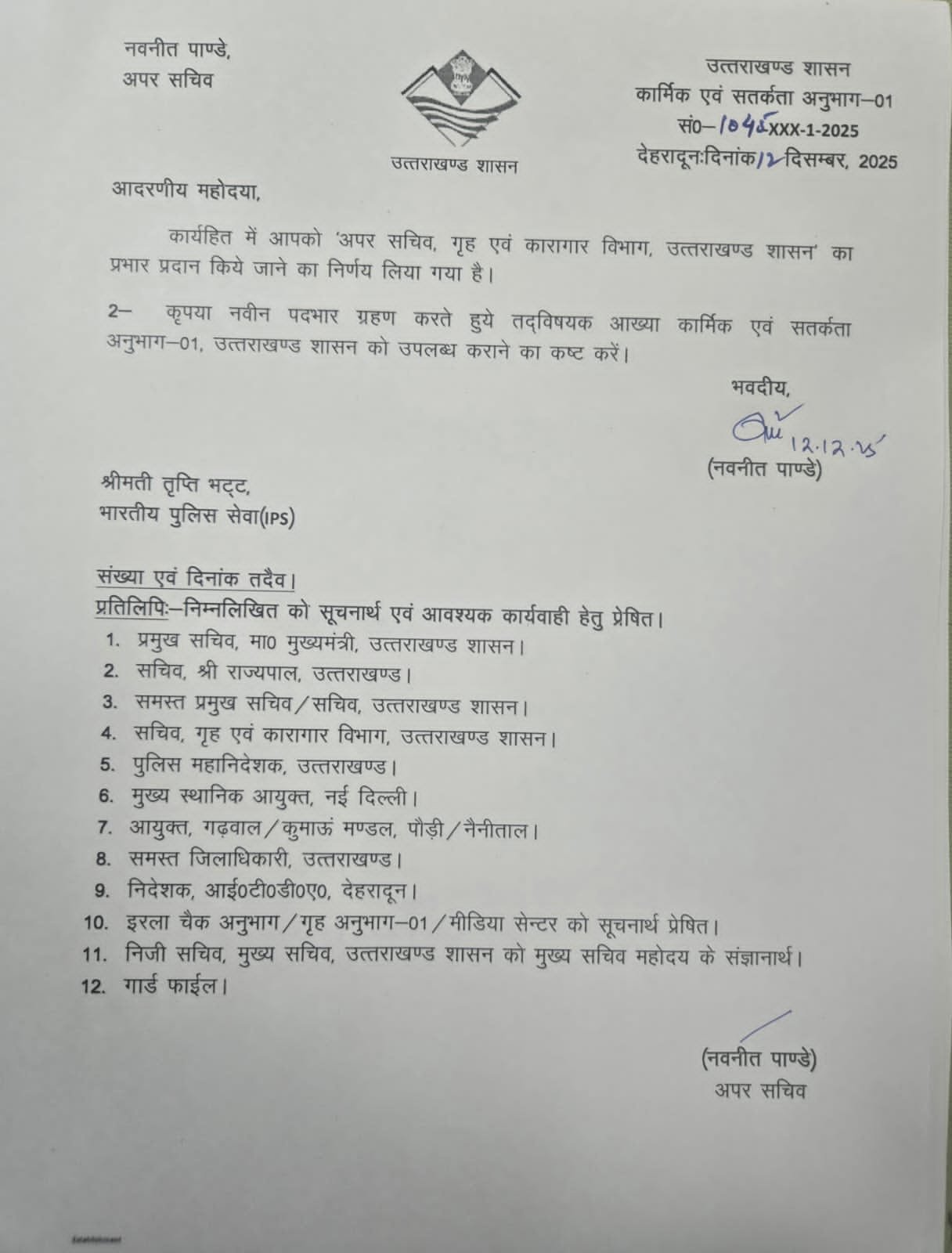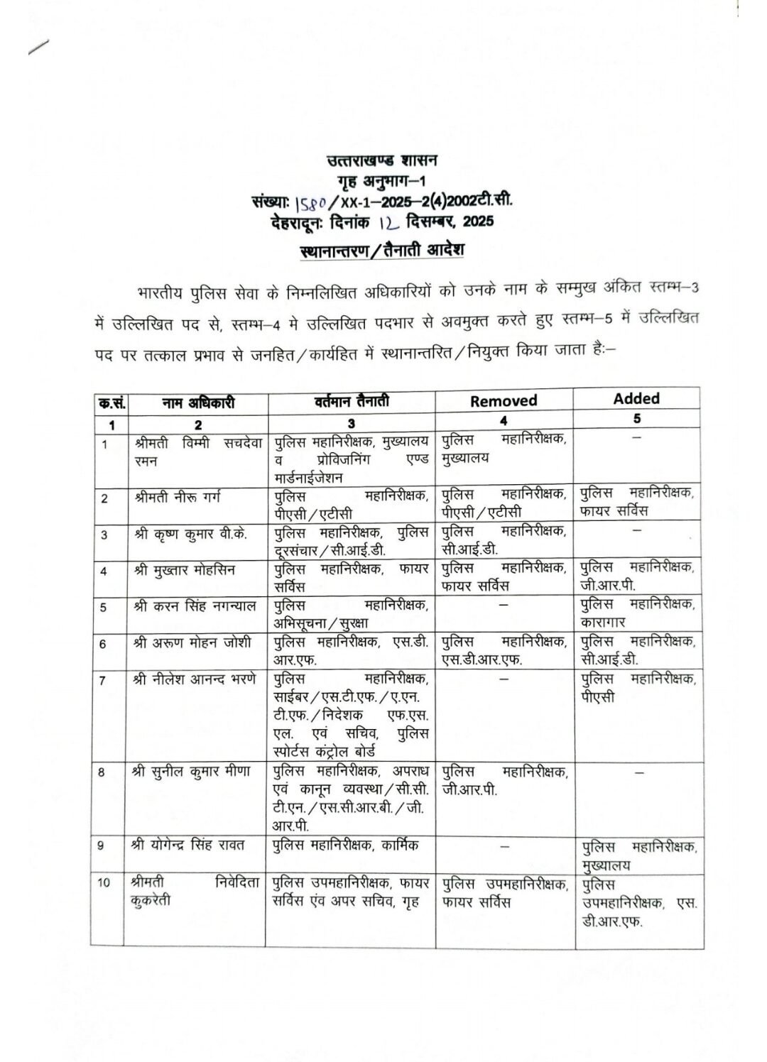 देहरादून : उत्तराखंड शासन से बड़ी खबर है। बता दे कि उत्तराखंड में आईपीएस अधिकारियों के ट्रांसफर किए गए हैं कई अधिकारियों के दायित्वों में फेरबदल किया गया है।