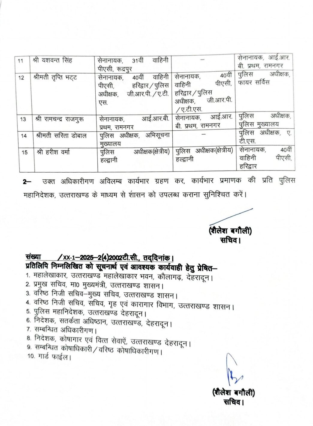 वहीं आईपीएस नीलेश आनंद भरणे को पुलिस महानिरीक्षक पीएसी का पद भार दिया गया है योगेंद्र सिंह रावत को पुलिस महानिरीक्षक मुख्यालय का पदभार सोंपा गया है। इसी के साथ निवेदिता कुकरेती को पुलिस उपमहानिरीक्षक एसडीआरएफ की जिम्मेदारी सौंपी गई है। सरिता डोबाल को पुलिस अधीक्षक एटीएस बनाया गया है ।