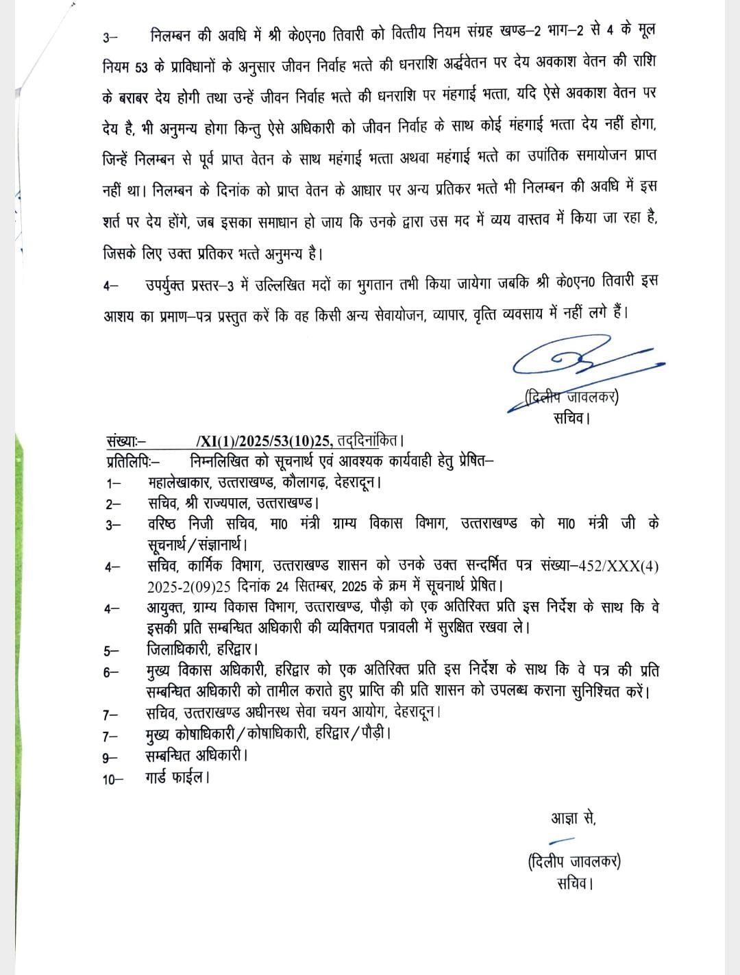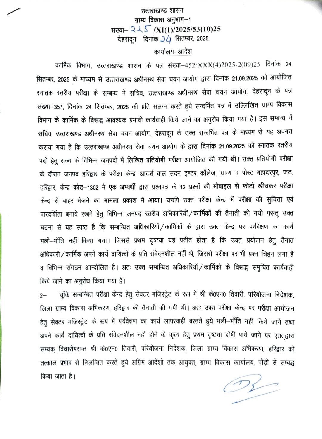 परीक्षा आयोजन के दौरान पर्यवेक्षण के कार्य में लापरवाही बरतने पर निलंबित किया गया है। अग्रिम आदेशों तक के एन तिवारी को आयुक्त ग्राम्य विकास कार्यालय पौड़ी से संबद्ध किया गया है।