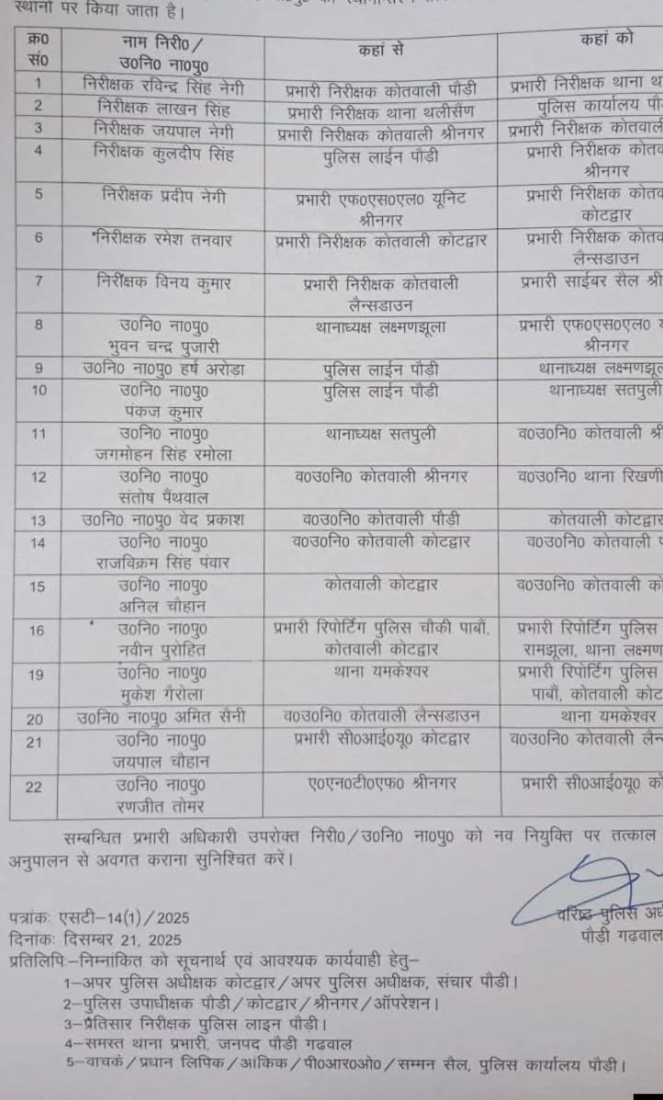 आपको बता दें कि 21 दिसम्बर को एसएसपी पौड़ी सर्वेश पंवार ने जनपद में पदभार संभालने के बाद 22 इंस्पेक्टर व दारोगाओं के ट्रान्सफर लिस्ट जारी की। इस लिस्ट के बाद जनपद में नियुक्त पुलिसकर्मियों में खलबली मच गई।