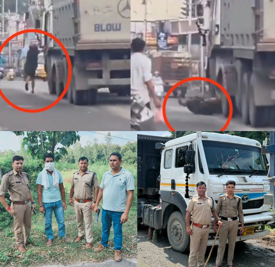 वायरल वीडियो का संज्ञान लेते हुए देहरादून एसएसपी ने तुरंत सम्बन्धित वाहन चालक के विरूद्ध आवश्यक वैधानिक कार्यवाही के निर्देश दिये गये। वायरल वीडियो की जांच में उक्त घटना सहस्त्रधारा क्रॉसिंग के पास की होनी पाई गई तथा घटना में शामिल डम्पर का नंबर: एचआर-58-ई-5666 होना प्रकाश में आया, जिस पर रायपुर पुलिस द्वारा सम्बन्धित वाहन चालक के सम्बन्ध में जानकारी प्राप्त की गयी तो उक्त वाहन चालक का डम्पर को लेकर हिमांचल की ओर जाना प्रकाश में आया, जिस पर पुलिस द्वारा त्वरित कार्यवाही करते हुए उक्त डम्पर के चालक प्रमोद पुत्र विरमानंद निवासी ग्रा0 रंईयावाला, थाना प्रतापनगर जिला यमुनानगर हरियाणा उम्र 25 वर्ष को पौंटा से हिरासत में लिया गया तथा सम्बन्धित वाहन को सीज किया गया।