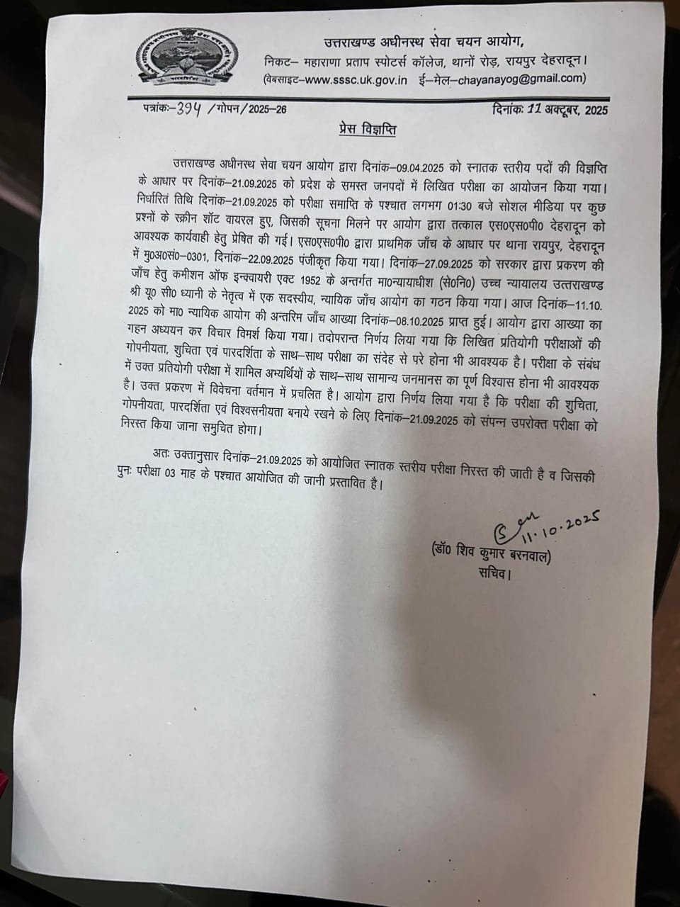 देहरादून। उत्तराखंड अधीनस्थ सेवा चयन आयोग द्वारा 21 सितंबर, 2025 को आयोजित प्रतियोगी परीक्षा में कथित अनियमितताओं की जांच हेतु राज्य सरकार द्वारा गठित एकल सदस्यीय जांच आयोग ने आज मुख्यमंत्री श्री पुष्कर सिंह धामी से भेंट कर अंतरिम रिपोर्ट प्रस्तुत की इसके साथ ही आयोग की तरफ से इस परीक्षा को रद्द कर दिया गया अब ये परीक्षा तीन महीने के बाद होगी।
