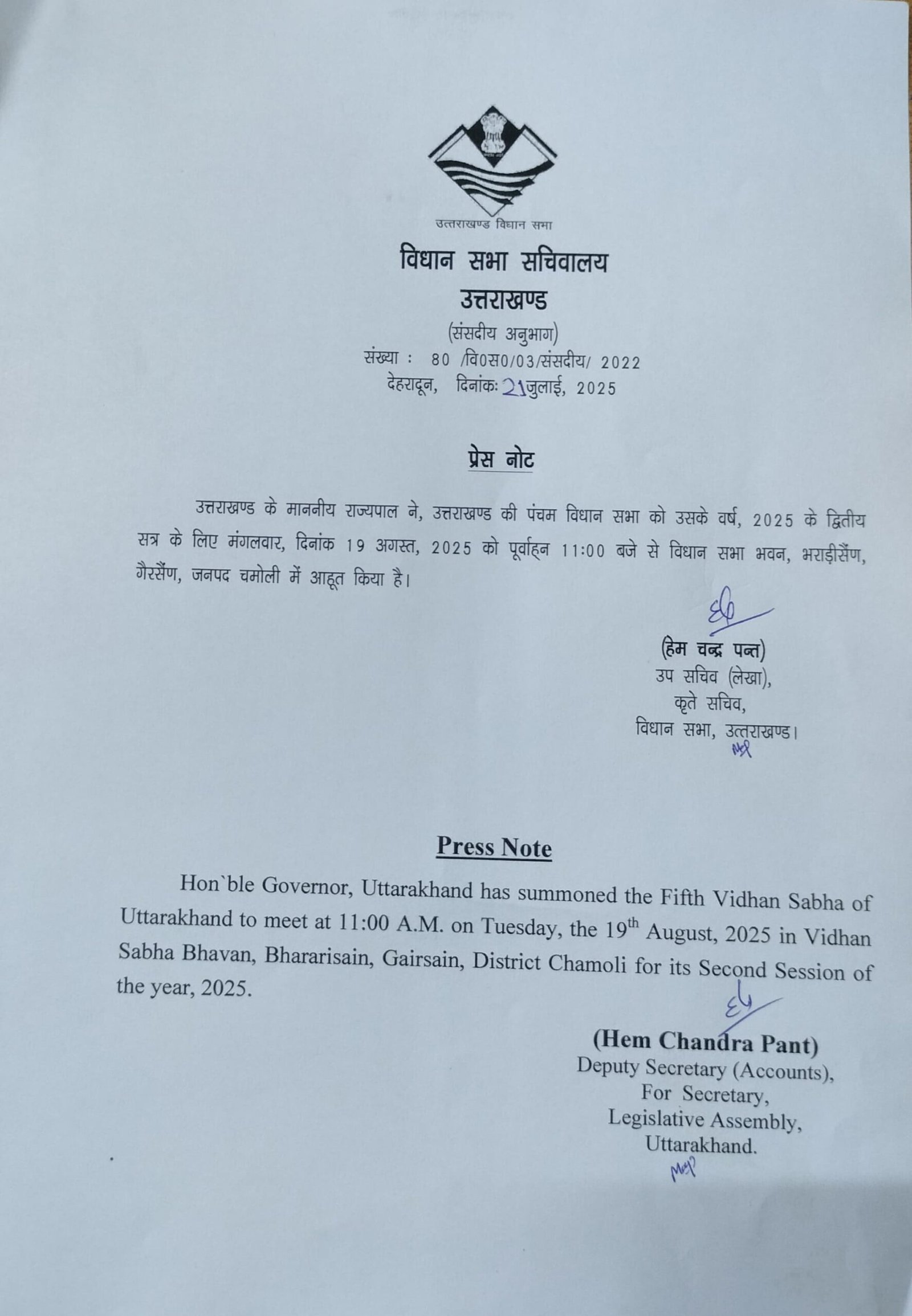 19 अगस्त को सुबह 11:00 बजे उत्तराखंड की ग्रीष्मकालीन राजधानी गैरसैंण में शुरू होगा सत्र
