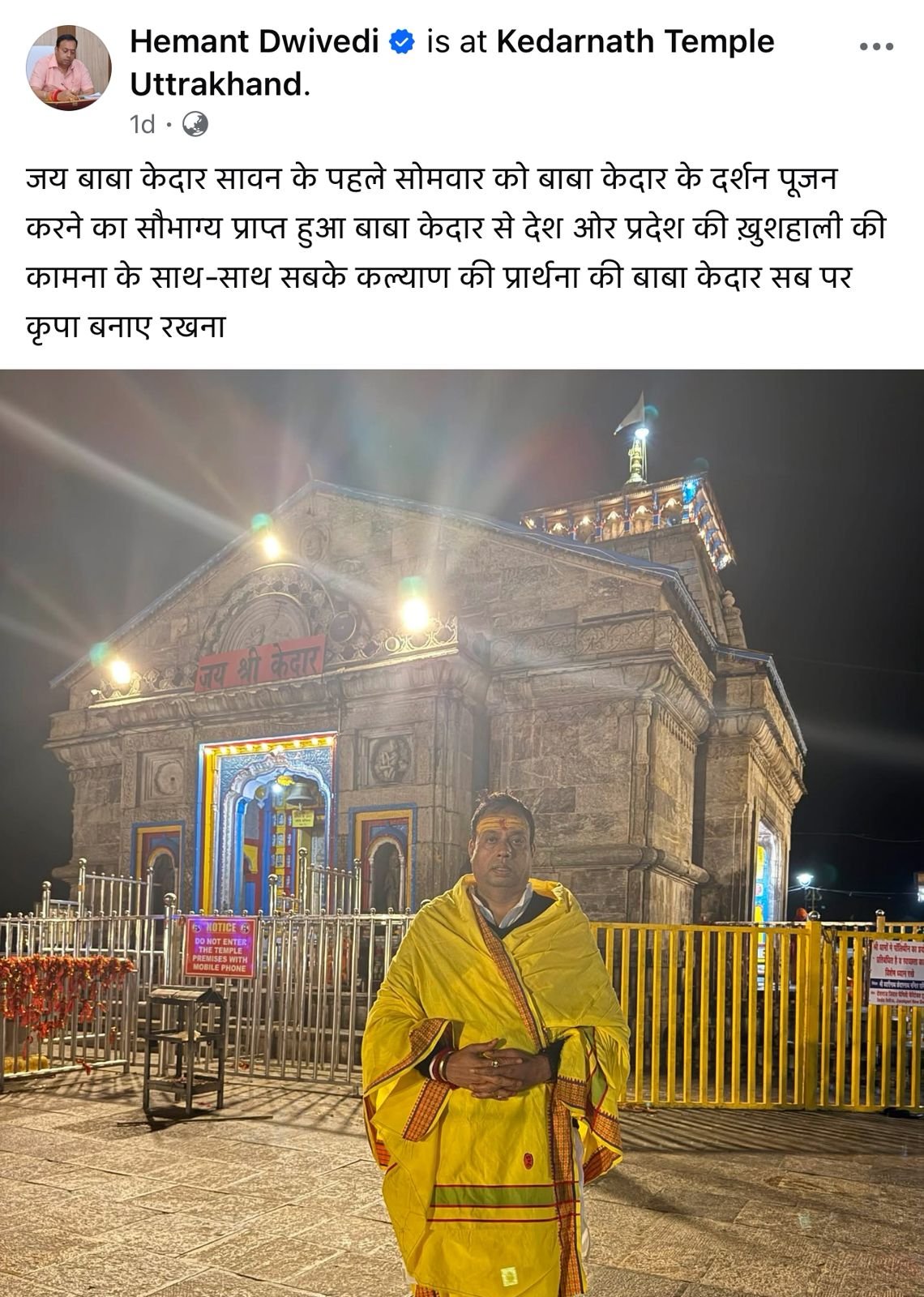 14 जुलाई को सावन के पहले सोमवार के मौके पर हेमंत द्विवेदी पहुंचे थे हेलीकॉप्टर से केदारनाथ
