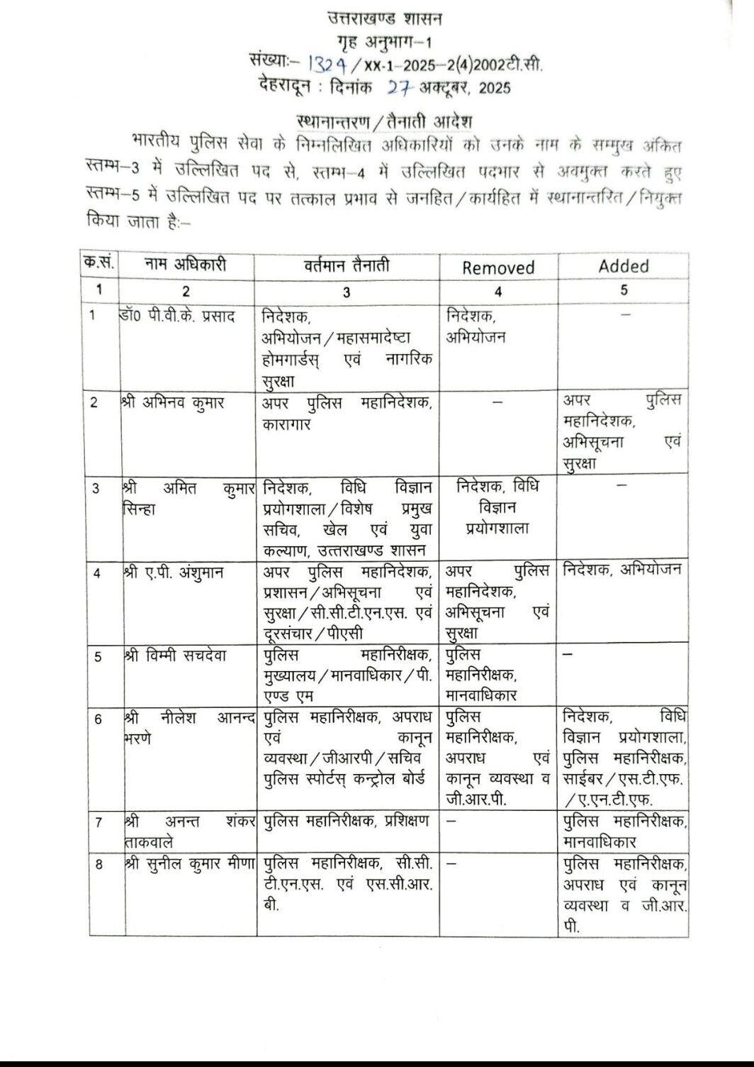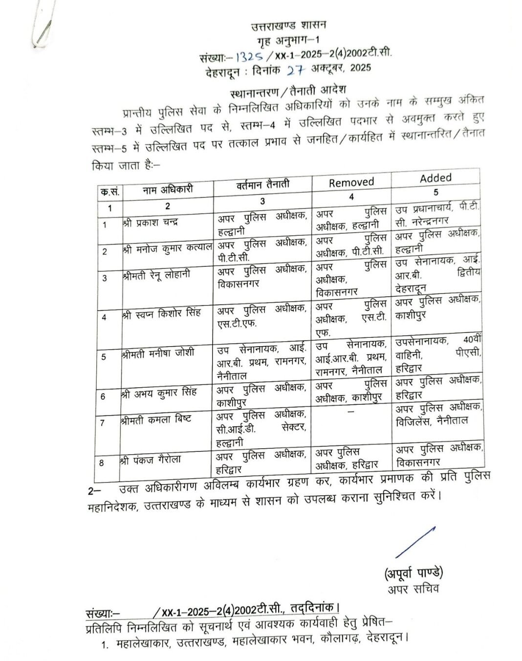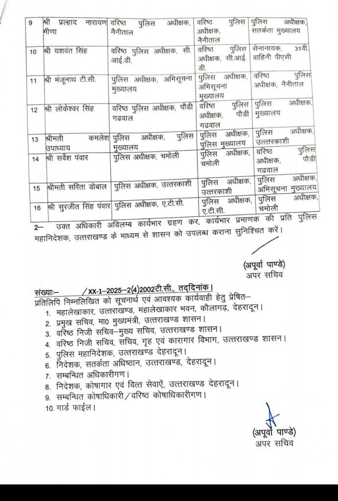 देहरादून : उत्तराखंड शासन ने उत्तराखंड में आईपीएस और पीपीएस अधिकारियों के ट्रांसफर किए हैं सर्वेश पंवार को पौडी का एसएसपी तो कमलेश उपाध्याय को उत्तरकाशी का एसएसपी बनाया है. वहीं पुलिस मुख्यालय में तैनात मंजूनाथ टीसी को नैनीताल एसएसपी बनाया गया है। पंकज खैरोला को अपर पुलिस अधीक्षक विकासनगर बनाया गया है।